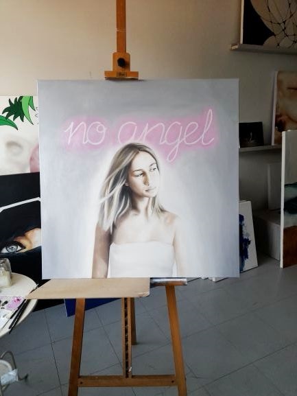 As it usually happens with all my paintings, I start knowing exactly what I want to do and while working on it, everything changes. Sometimes I actually tend to believe that the painting decides for its own fate, regardless my will. This is exactly the case with “Nikki”. I started having a vision of an ethereal beauty that is blown by the wind and gradually vanishes in the white background. I wanted it to be loose and dreamy. Everything went as planned until I saw this dream the other night where Nikki was a wild clubber, coming in a club, like a contemporary madonna with neon pink lights over her blond hair. That was it. She decided something different and I couldn’t do anything about it anymore. I had to follow her will. So, this is where the thing is getting now. I am really wondering how it will come up at the end….