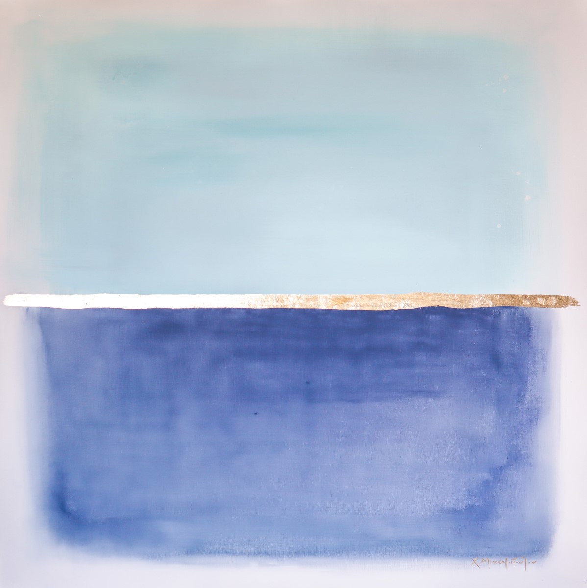 “Horizons”. Inspired by the breath-taking rooms’ view of Caldera, the Horizons Series consists of 9 different abstract landscapes in different shades of blue and turquoise combined with a delicate detail of gold leaf, all signed by the artist.