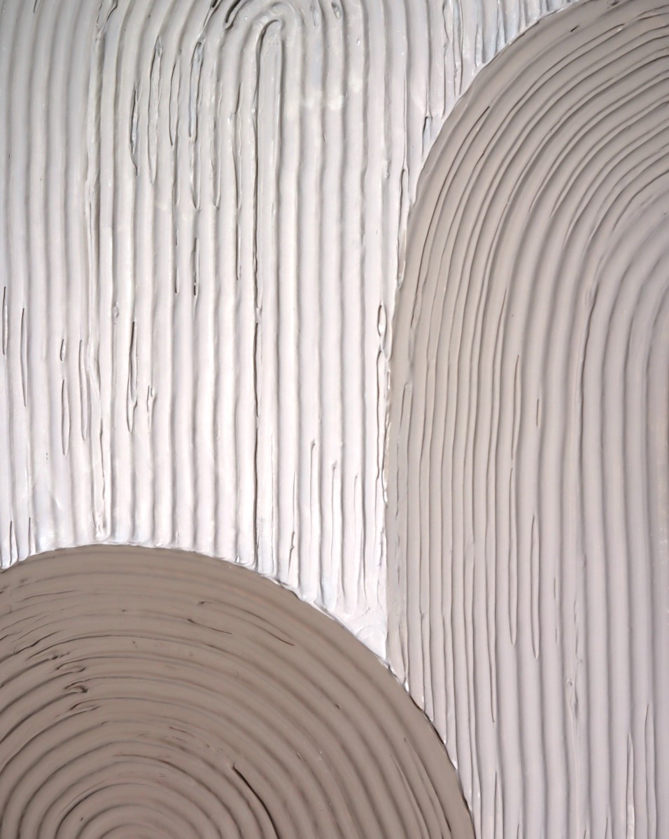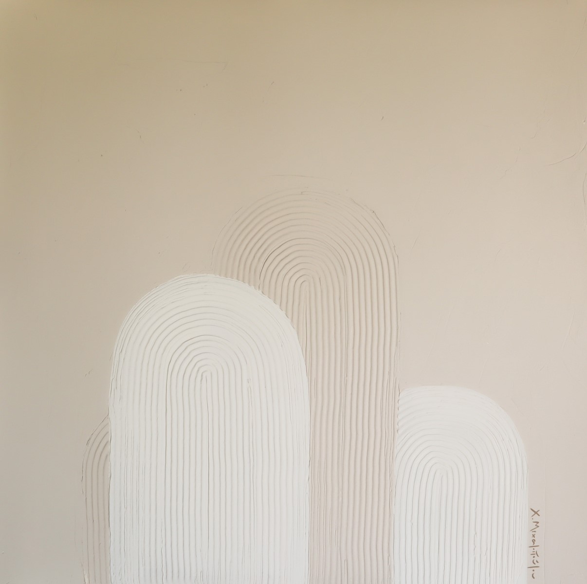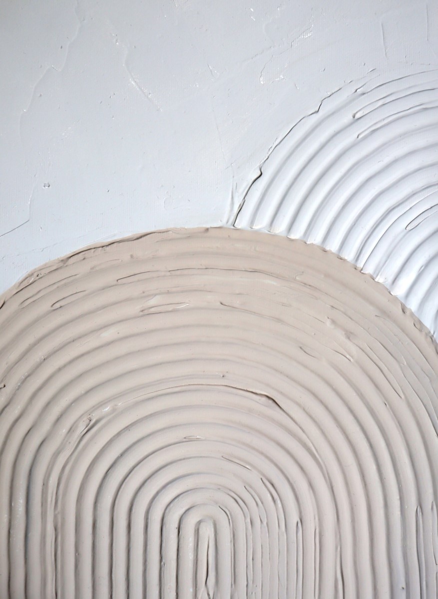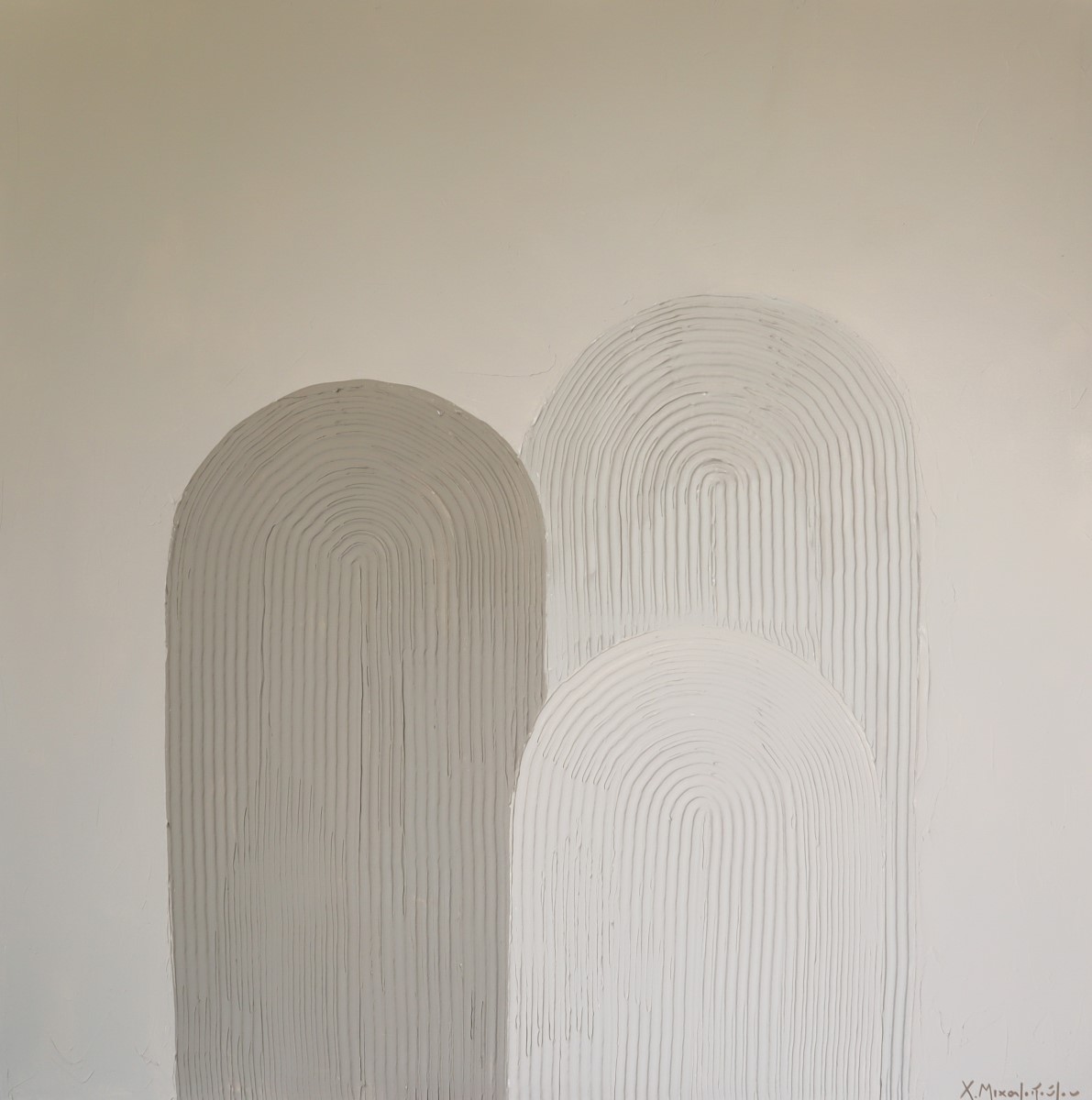 “Gaia”. Inspired by the geometrical round shapes of the Aegean architecture and the soft palette of earth, these 8 artworks come in a contradiction with their intense texture. 8 artworks of mixed media on stretched canvas.